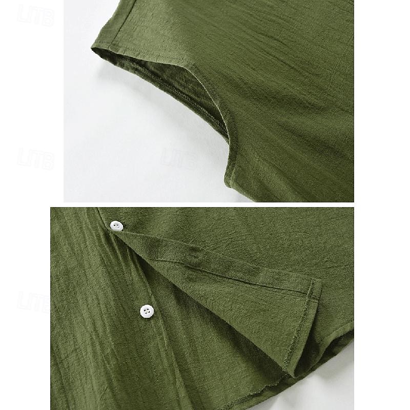 Men's Shirt Linen Shirt Cotton Linen Shirt White Cotton Shirt Summer Shirt Beach Shirt Plain Vacation Street Khaki Army Green Sleeveless Lapel Summer Clothing Apparel Front Pocket 9