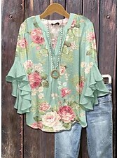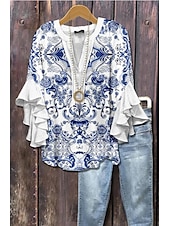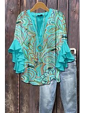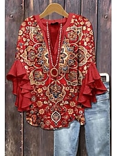 More information about Women's Retro Blouse Layered Ruffle Sleeve Tops Vintage Floral Graphic Paisley Daily Stylish Casual 3/4 Length Sleeve Regular Tops Daily Holiday Vacation Wear Print Red Blue Sky Blue Green