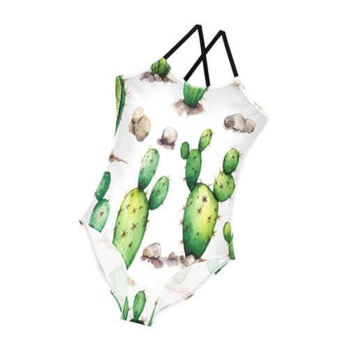 Watercolor Green Cactus White Child Girl Swimsuit, Beach Bathing Suit 3-10 Y with Adjustable Shoulder Strap, 3-10 Y 4