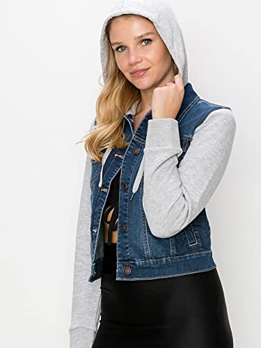 • Classic drawstring hooded denim jacket is button down closure with long fleece sleeves