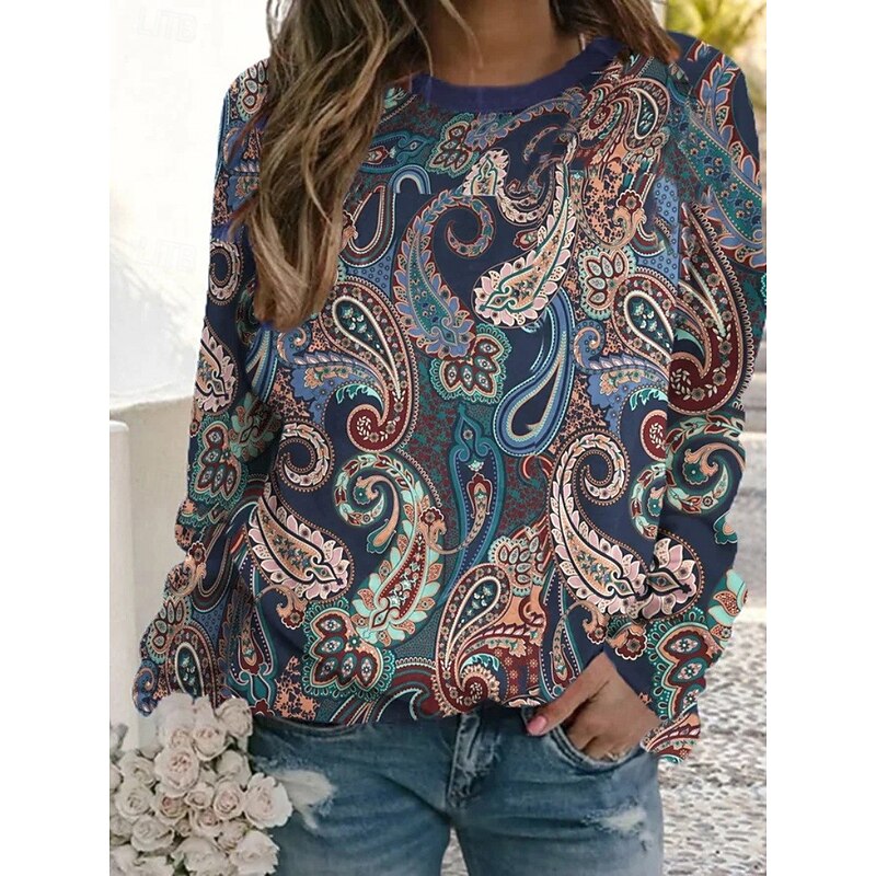 Highlights [Fabric]: Made from high-quality polyester, this women's pullover features a micro-elastic fabric that ensures a comfortable and breathable fit suitable for spring, fall, and winter. [Fit and Style]: This relaxed fit, long sleeve T-shirt offers a loose silhouette with a regular top length, perfect for a casual, laid-back look. The round neckline contributes to its versatile style, making it easy to pair with other wardrobe staples. [Design Highlights]: The top showcases a vibrant geometric and tribal print, bringing an ethnic flair to your fashion collection. The intricate and colorful patterns, including a blend of blues, reds, yellows, and purples, ensure you'll make a bold statement wherever you go. [Occasions]: Ideal for street and casual occasions, this pullover is perfect for those who enjoy expressing their unique style. Whether you're heading out for a casual day in the city or attending a laid-back weekend gathering, this top serves as a standout piece. [Size Range]: Available in a variety of sizes from S to 3XL, it is designed to fit true to your regular size, ensuring comfort and style for a broad range of body types.