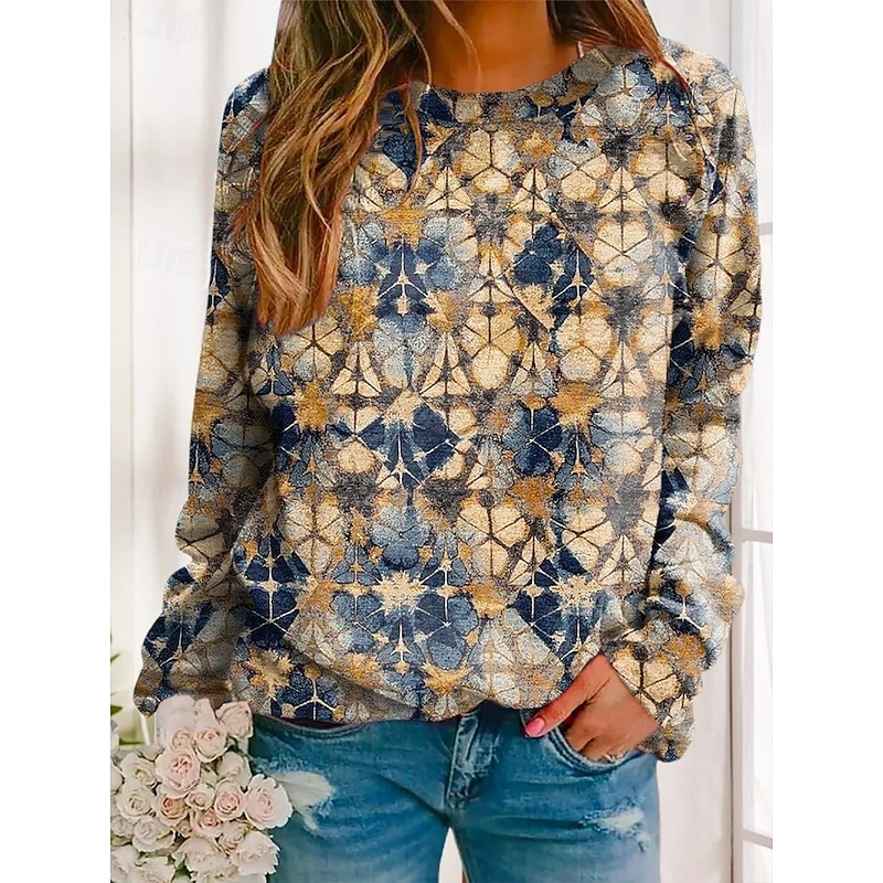 HOT ! Women's Pullover Fashion Ethnic Print Geometric Tribal Street Casual Round Neck Print Loose Fit Long Sleeve Yellow Red Brown Dark Blue Gray Spring Fall & Winter