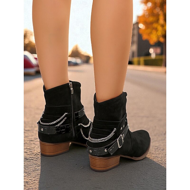Women's Brown Suede Ankle Boots with Chain and Belt Detail - Trendy Western Style Chunky Heeled Booties for Casual Wear and Fall Outings 4