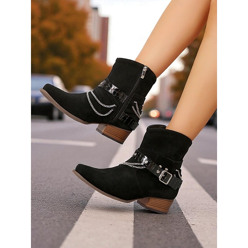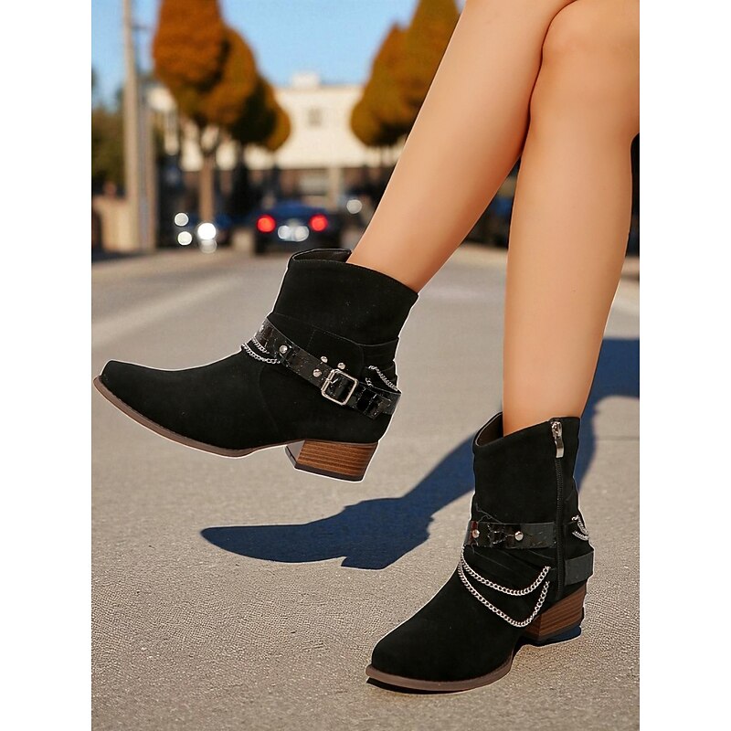 Women's Brown Suede Ankle Boots with Chain and Belt Detail - Trendy Western Style Chunky Heeled Booties for Casual Wear and Fall Outings 13