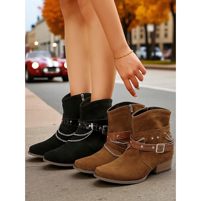 Women's Brown Suede Ankle Boots with Chain and Belt Detail - Trendy Western Style Chunky Heeled Booties for Casual Wear and Fall Outings 11