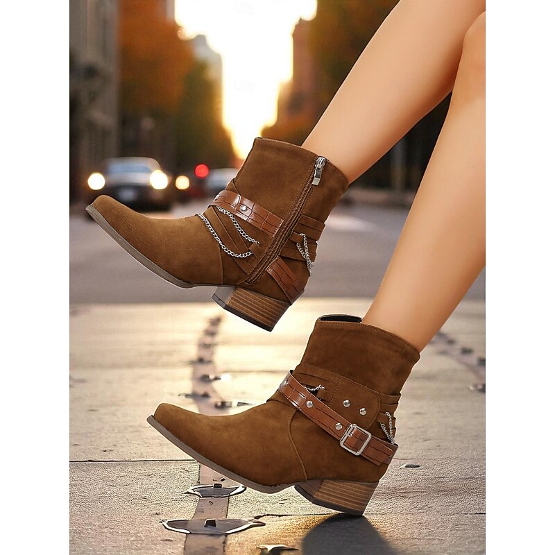 Women's Brown Suede Ankle Boots with Chain and Belt Detail - Trendy Western Style Chunky Heeled Booties for Casual Wear and Fall Outings 1