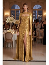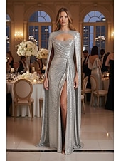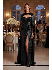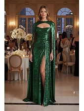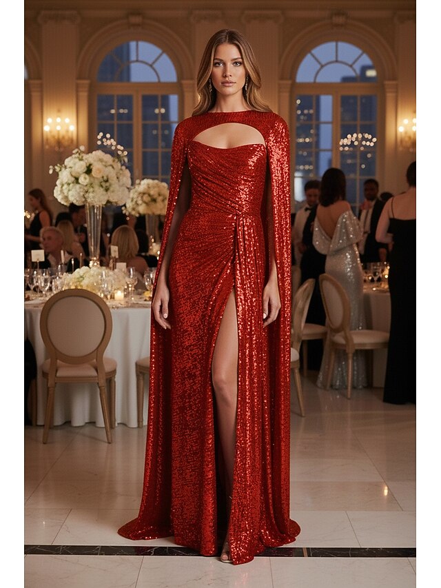 More information about Formal Cape Dress Sheath / Column Red Glittered Detachable Evening Gown Elegant Dress Wedding Sweep / Brush Train Sleeveless Strapless Sequined with Ruched Slit 2025