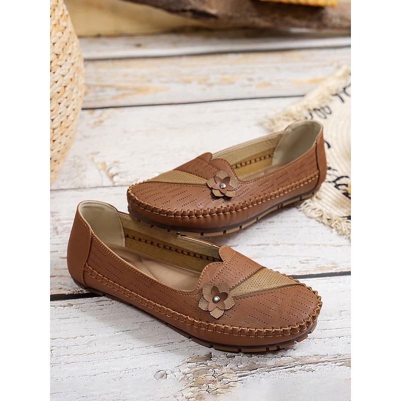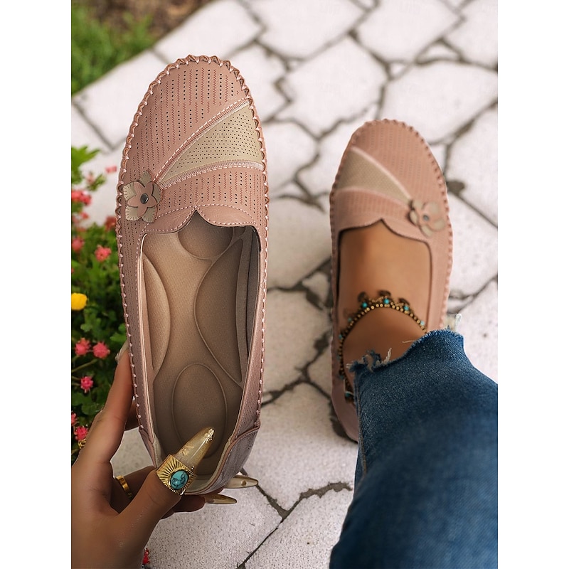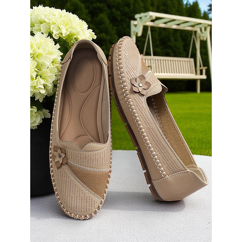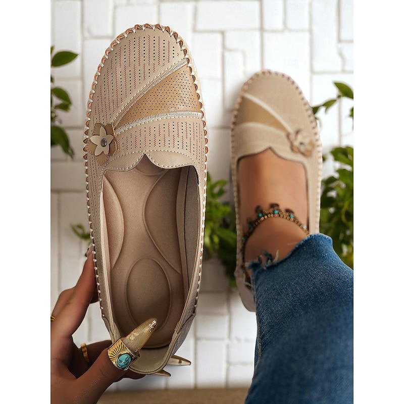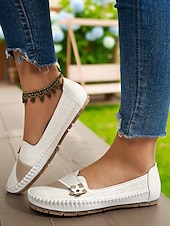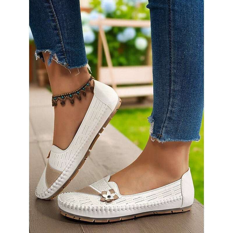 HOT ! Women's White Perforated Loafers with Flower Detail – Soft Casual Flats for Garden Strolls, Driving and Everyday Comfort