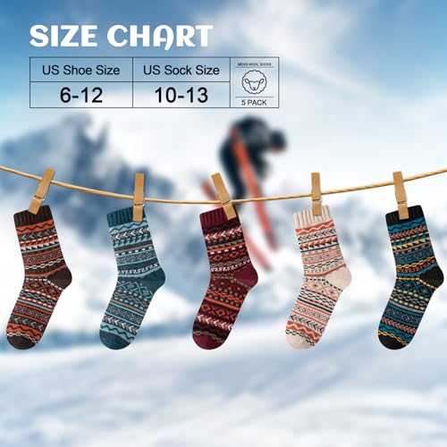 HOT ! COOPLUS Wool Socks Mens Thick Winter Warm Hiking Pattern Thermal Crew Socks for Cold Weather 5 Pairs