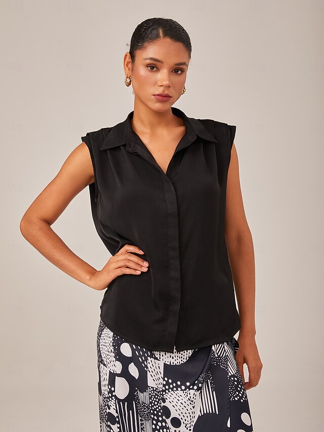 HOT ! Satin Casual Solid Sleeveless Collared Shirt