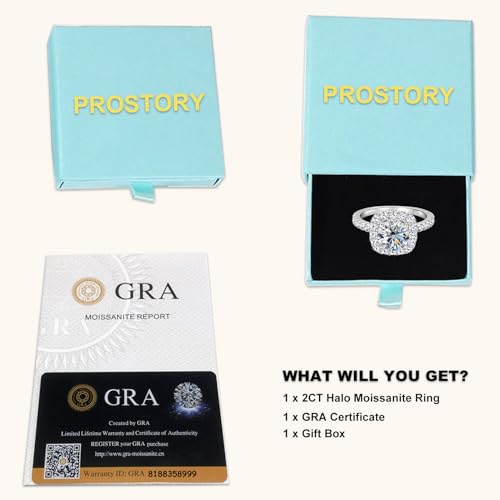 • REAL 925 STERLING SILVER: This 2ct halo moissanite engagement ring is made of 925 sterling silver with S925 metal stamps and have passed strict quality checks. PROSTORY uses advanced plating technology, so our jewelry can maintain a longer gloss and not fade for at least one year.