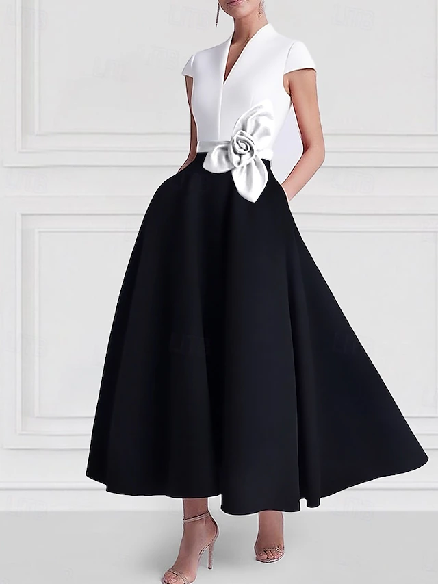 HOT ! Black and White A-Line Cocktail Dresses Elegant Dress Formal Wedding Ankle Length Short Sleeve V Neck Pocket Satin with Pocket