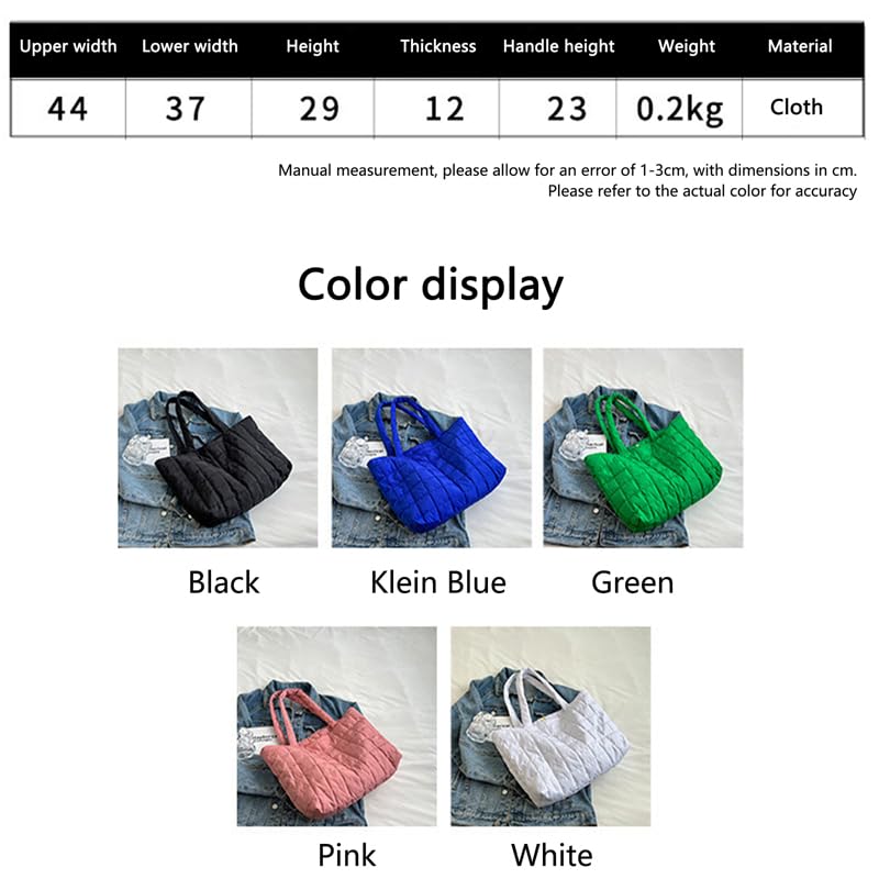 • Size: The size of this large quilted puffer tote bag is 44 * 29 * 12 cm / 17.32 * 11.42 * 4.72 inch; Large capacity design, can store daily necessities such as tissues, wallets, cosmetics, etc