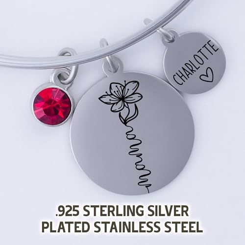 • DAINTY 20mm pendant, 10mm name charm, and 7mm birthstones. Choose your size, medium (60mm diameter) or large (65mm bracelets).