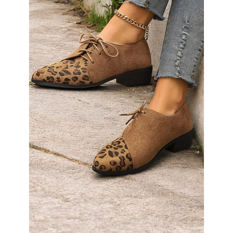 Brown Faux Suede Leopard Print Oxford Shoes - Stylish Lace-Up Flats for Women, Perfect for Casual and Vintage Looks 1