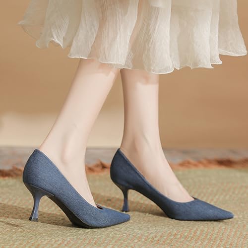 Women's Denim Closed Pointed Toe Kitten Heel Dress Pumps Lightweight Slip-On Comfortable Non-Slip High Heel for Work Party Prom Daily 5