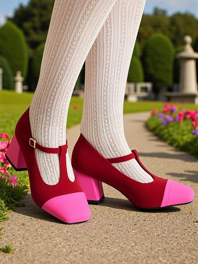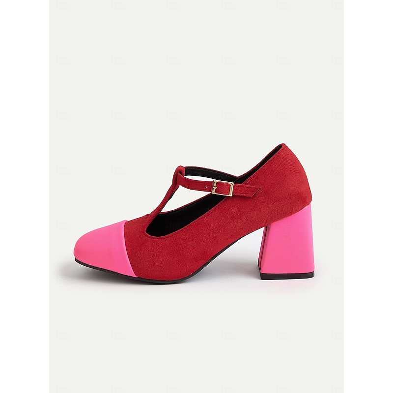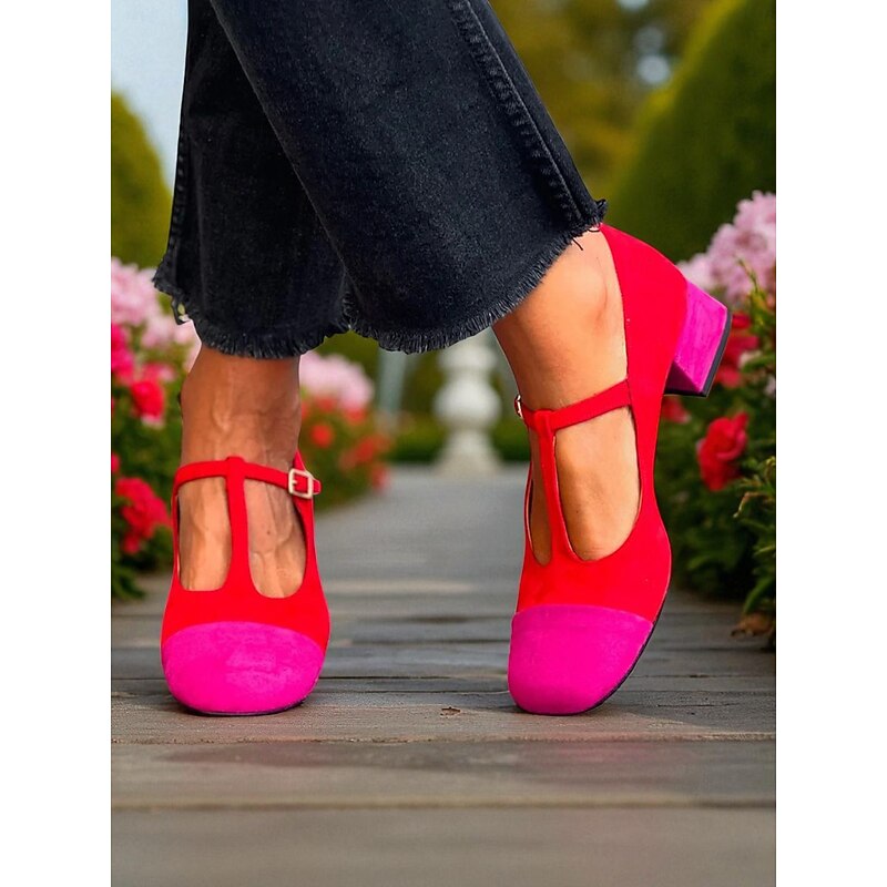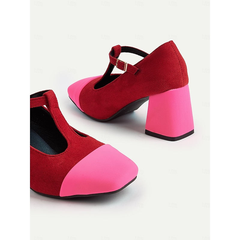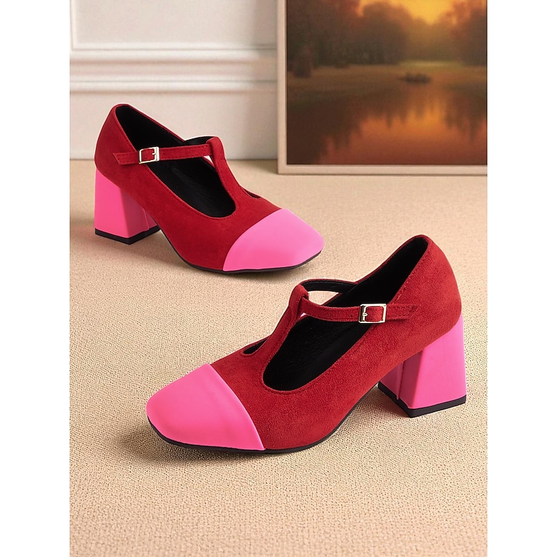 Women's French Style Red and Pink T-Strap Block Heel Mary Jane Pumps - Retro Comfortable Walking Shoes for Afternoon Tea, Parties, Office, and Daily Outfits 1