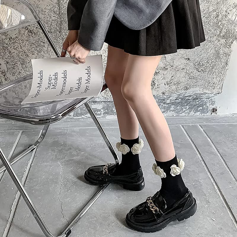 HOT ! Women’s Delicate Floral Embroidery Cotton Mid-Calf Socks with 3D Flower at Ankle, two pairs