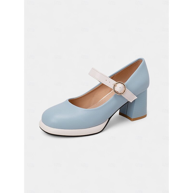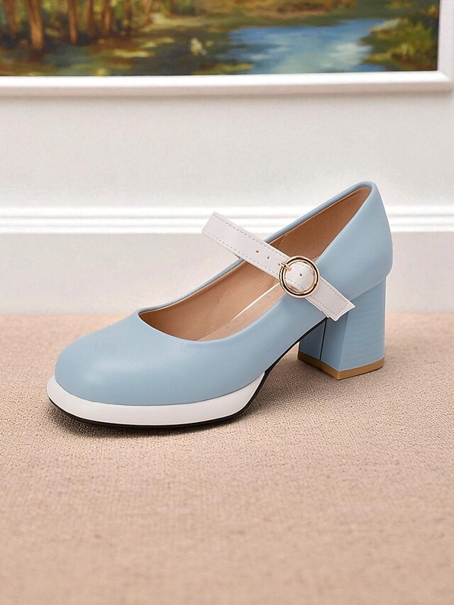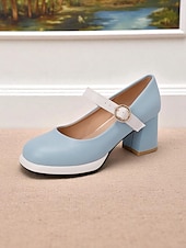 HOT ! Women's 1950s Mod Mary Jane Heels - Retro Blue and White Round Toe Chunky Heel Shoes with Strap for Vintage Outfits, Tea Parties or Daily Wear