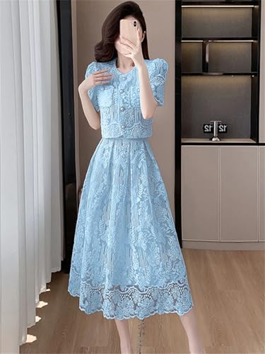 HOT ! Women Embroidery Lace 2 Piece Set Beaded Flower Single Breasted Short Top A Line Midi Skirt Suits High Qu