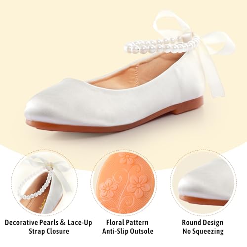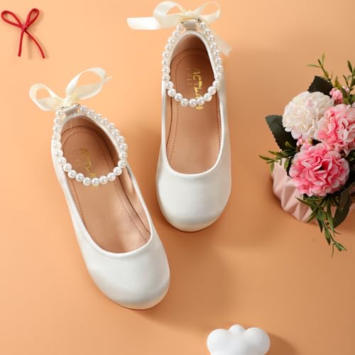 Toddler Girls Dress Shoes Flower Girls Mary Jane Ballet Flats Decorative Pearls Lace-Up Ankle Strap Wedding Communion Princess Shoes 4