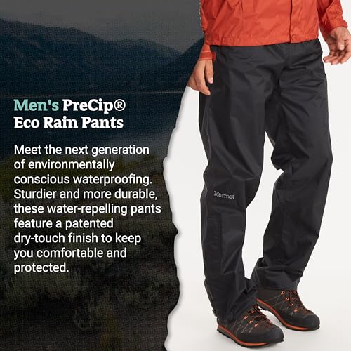 • Stay Comfortable and Dry - Designed for adventure even in rain, the PreCip Eco Pant is durable and designed with fully waterproof and breathable PFC-free DWR Marmot NanoPro nylon ripstop fabric with fully sealed seams - perfect rain pants for men whether jogging, hiking, golfing, or just to add to your best backpacking gear