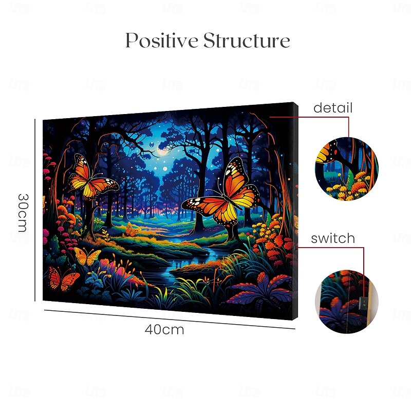 Highlights [Fabric] : Crafted from high-quality nonwoven material, this LED canvas art offers a durable and lightweight option for easy wall mounting and display. Its sturdy construction ensures longevity while retaining its vibrant colors and intricate details. [Style] : The LED canvas features a classic design that merges a calming forest scene with modern illumination techniques, creating a unique blend of elegance and contemporary flair. [Design Highlights] : This artwork showcases a captivating 3D printed night forest scene adorned with vibrant butterflies in striking orange and yellow hues. The serene blue forest background provides an enchanting contrast, while the embedded LED lights bring the scene to life, casting a warm glow that highlights the exquisite details and adds a magical touch to your decor. [Occasions] : Perfect for creating a serene ambiance in various settings such as living rooms, bedrooms, or home offices. Whether you're looking to enhance your home decor with a tranquil theme or to gift someone a unique piece of art, this LED canvas suits a variety of purposes and locations, adding charm and fascination. [Size Range] : Available in a convenient size of 30 x 40 cm (11.8 x 15.7 inches), this piece fits well on most walls and surfaces, allowing for versatile placement options to suit your decorative needs.