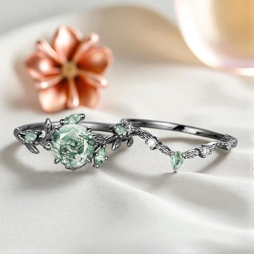 Nature Moss Agate Engagement Ring Set Black Gold Nature Inspired Wedding Rings For Women Moissanite Wedding Band Promise Anniversary Rings 6