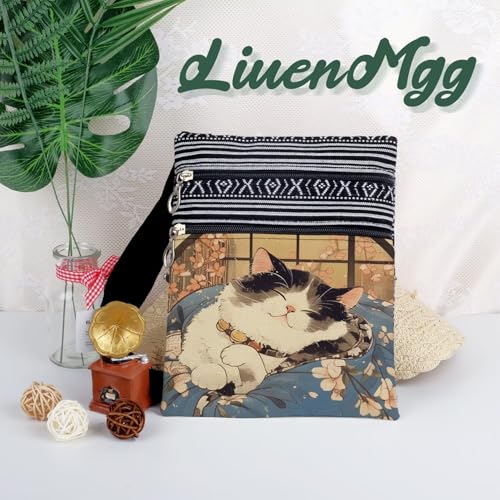 HOT ! Kimono Cat Messenger Bag Small Ethnic Pattern Adjustable Strap Crossbody Zipper Bag Japanese Style Cat Phone Bag Wallet Cute Shoulder Handbag for Cat Lovers Women