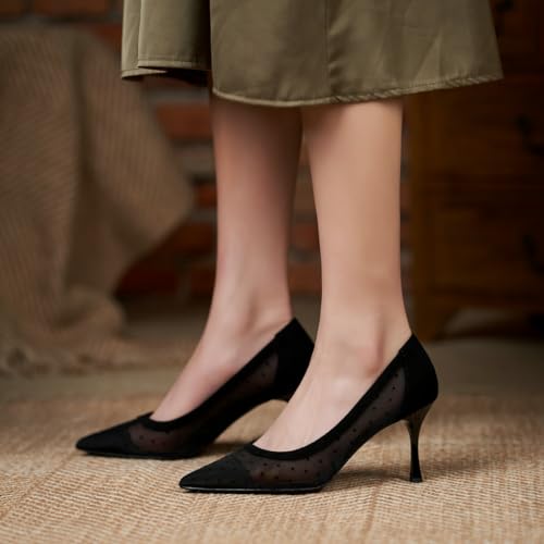 DINTAHA Womens Black Mesh Polka Dot Kitten Heels Low Heel Pointed Toe Pumps Low Heel Dress Office Shoes 7