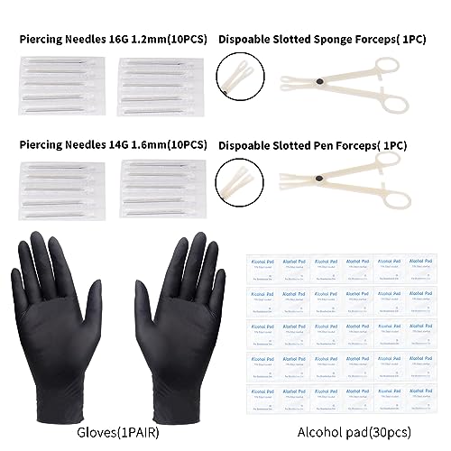 • 54pcs Piercing Kit tools: Black Latex Gloves(2PCS) 14G Piercing Needles(10PCS)16G Piercing Needles(10PCS)Disposable Piercing Clamps(2PCS). 30pcs other All items are 100% sterilized using ethylene oxide (EO) gas and packed safely