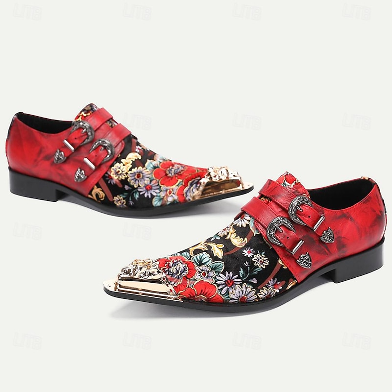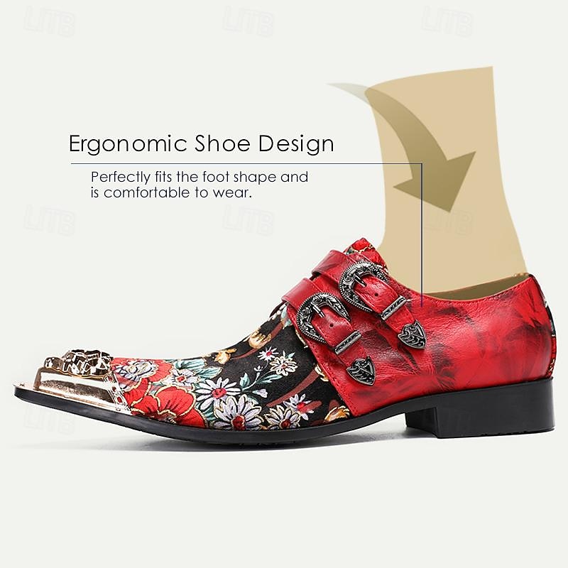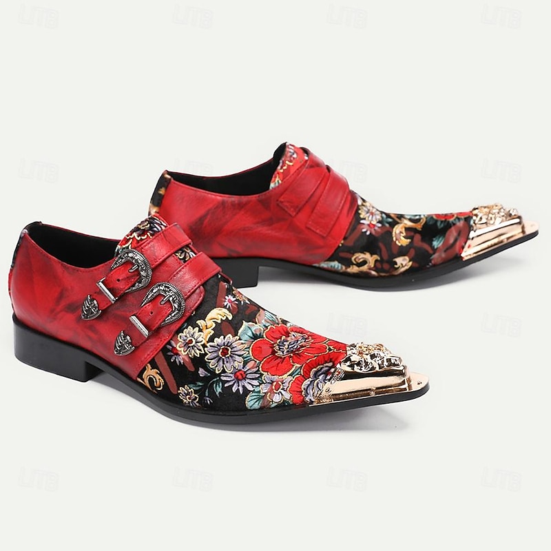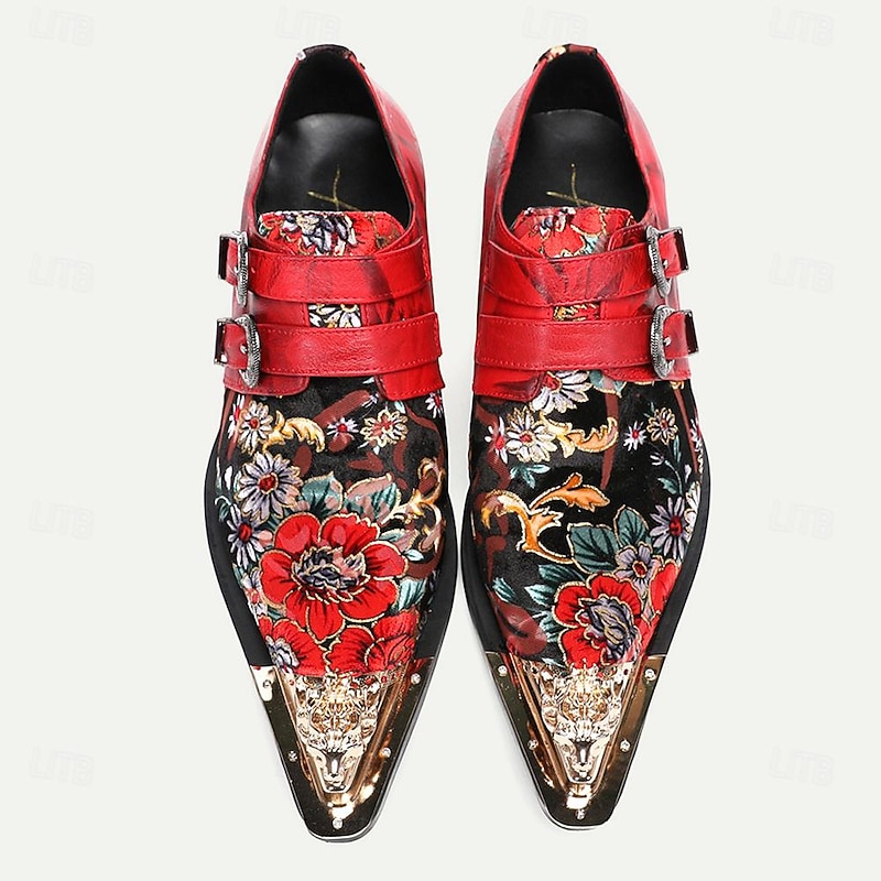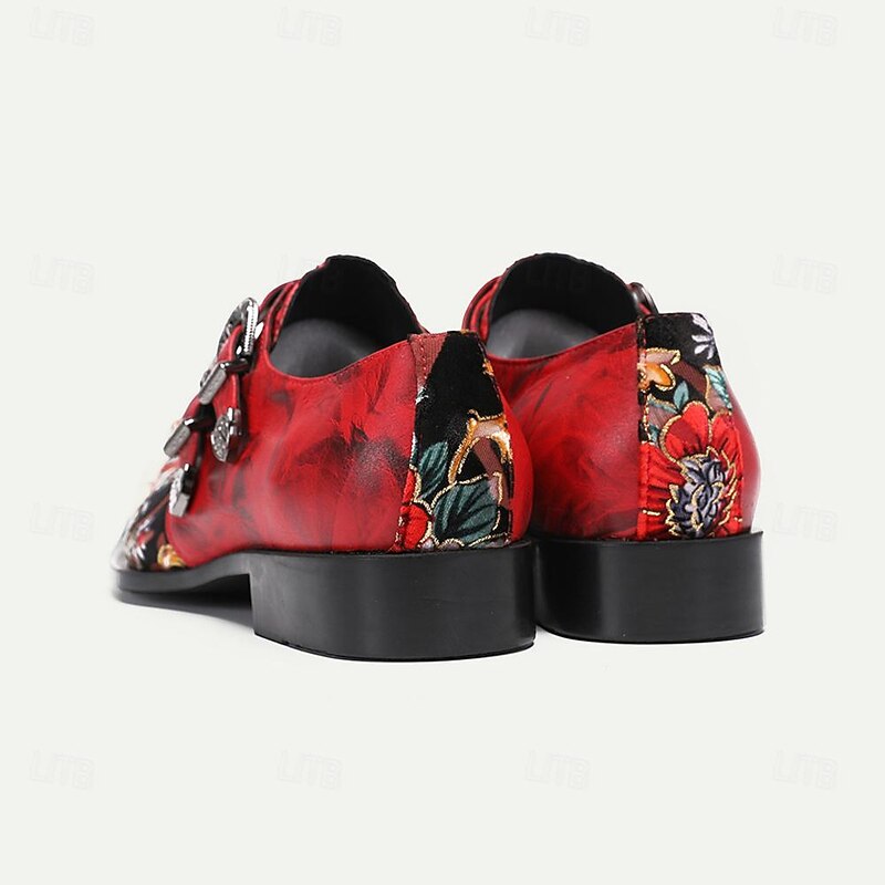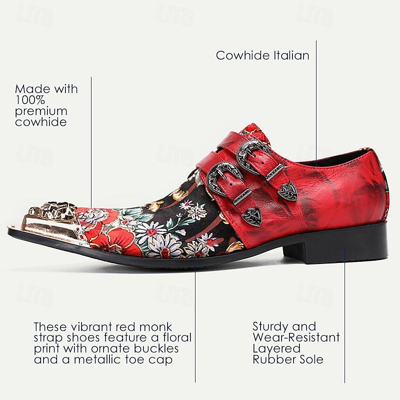 HOT ! Men's Red Leather Floral Embroidered Double Monk Strap Shoes with Metallic Toe Detail