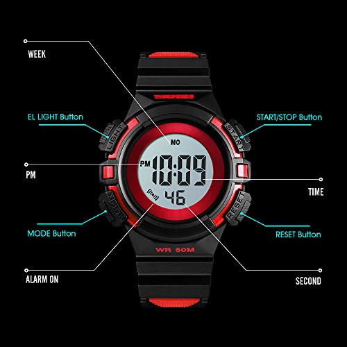 • Multi Function Digital Watch: 7 colors light, stopwatch, 50M waterproof, shockproof, calendar, alarm clock, week display, 12/24H.Your child could not only learn and tell time but also arrange their schedule by themself in a interesting way.
