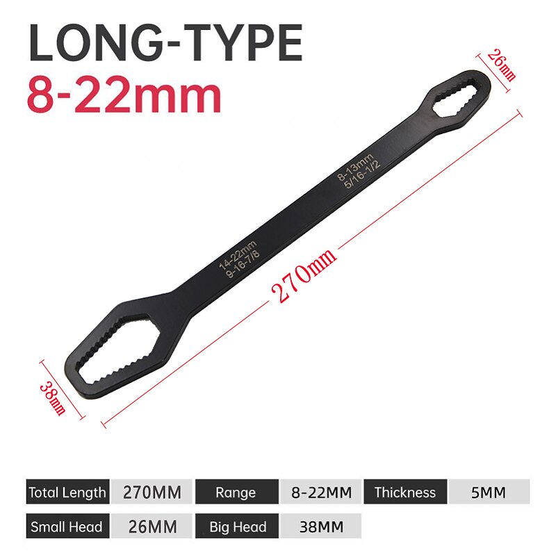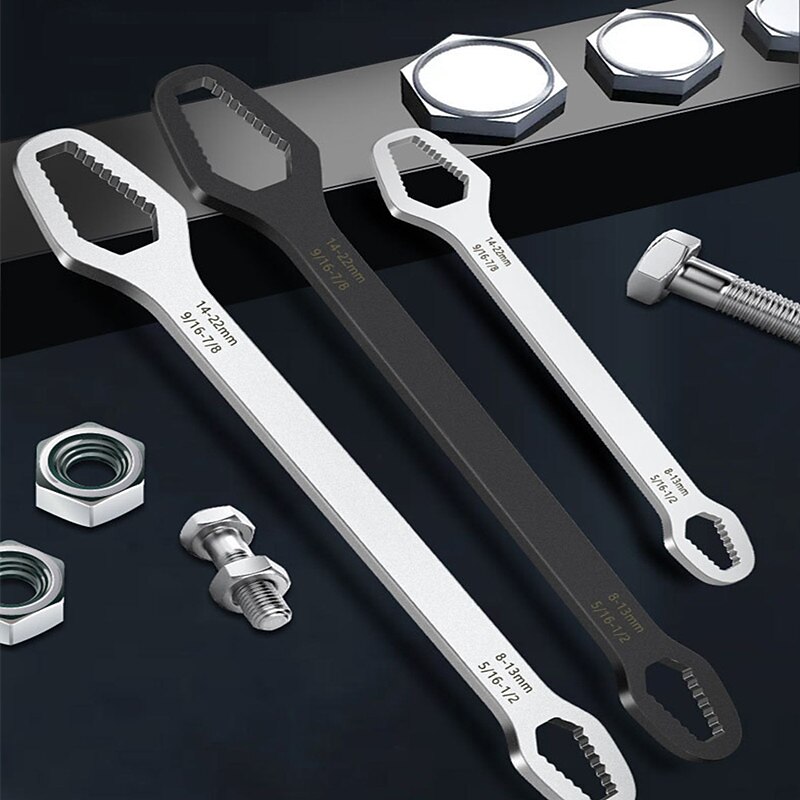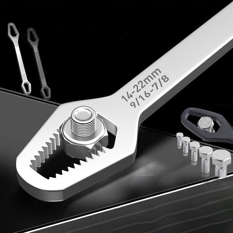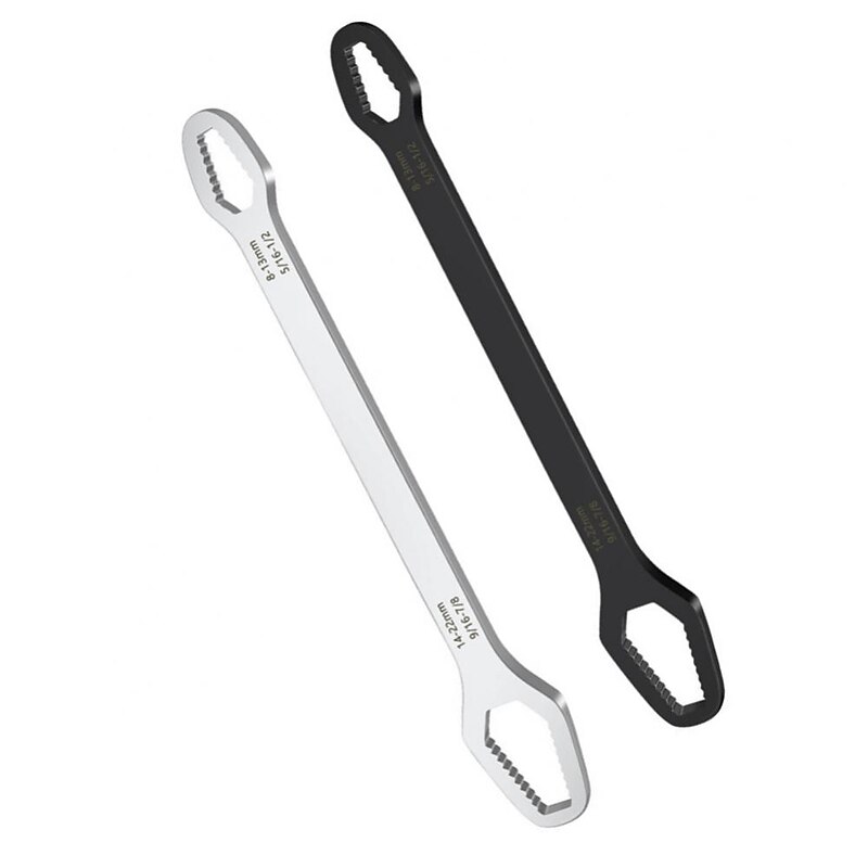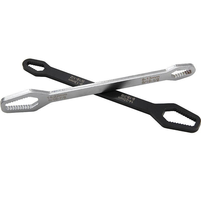 Highlights Product Selling Points: 1. All-in-one solution: The 8-22mm Double-Head Universal Spanner eliminates the need for multiple wrenches in your toolbox. 2. Suitable for various screws and nuts: The double heads of different sizes make it ideal for all kinds of nuts and bolts of standard 8-13mm and 14-22mm. 3. Made of chrome vanadium steel: It is strong and durable, making it an indispensable maintenance tool to solve various screw removal problems. 4. Designed for experts in the repair industry: This wrench is specially designed to satisfy the needs of professionals who require a wrench that can handle various types of screws. 5. Efficient and convenient: The longer shaft of the wrench provides extra leverage, saves time and effort, and is efficient and convenient. The unique tooth shape designed offers excellent torque, stability, and a non-slip grip. Overall, the 8-22mm Double-Head Universal Spanner is a must-have tool for every repair job. It is sturdy, versatile, and easy to use, making it an indispensable item for both experts and beginners alike.