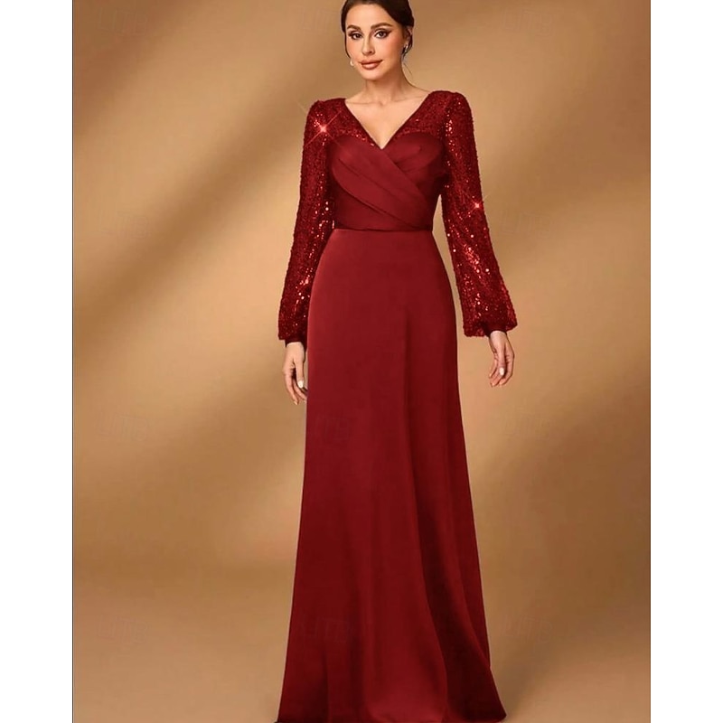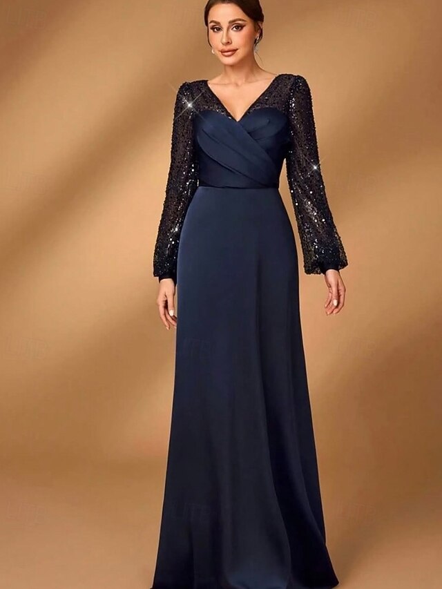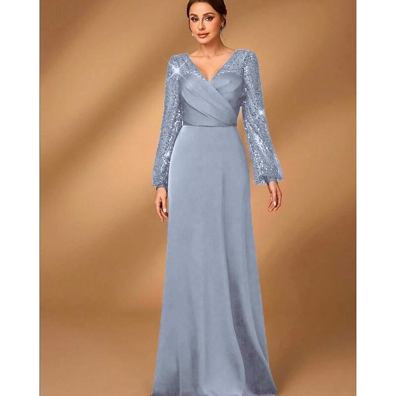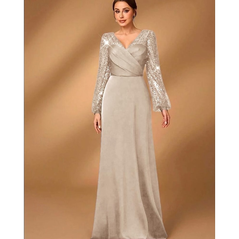 More information about A-Line Mother of the Bride Dress Elegant Simple Minimalist V Neck Floor Length Satin Sequined Long Sleeve with Pleats