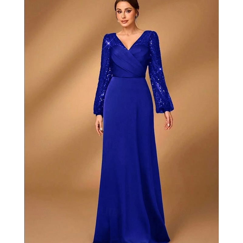 HOT ! A-Line Mother of the Bride Dress Elegant Simple Minimalist V Neck Floor Length Satin Sequined Long Sleeve with Pleats