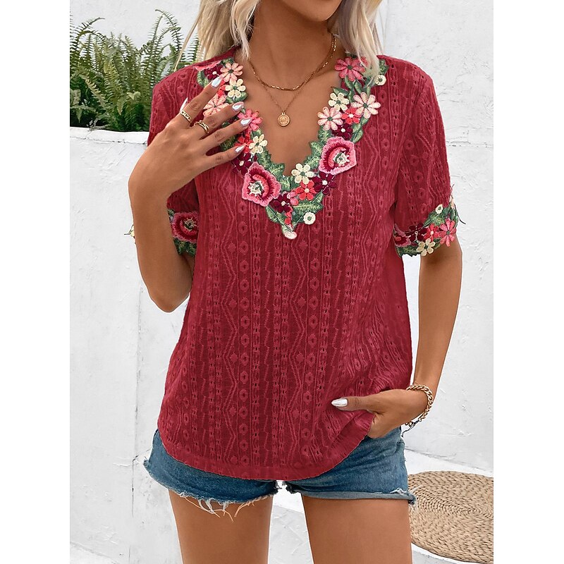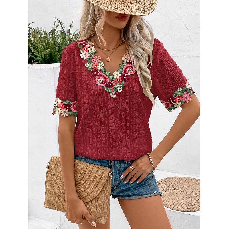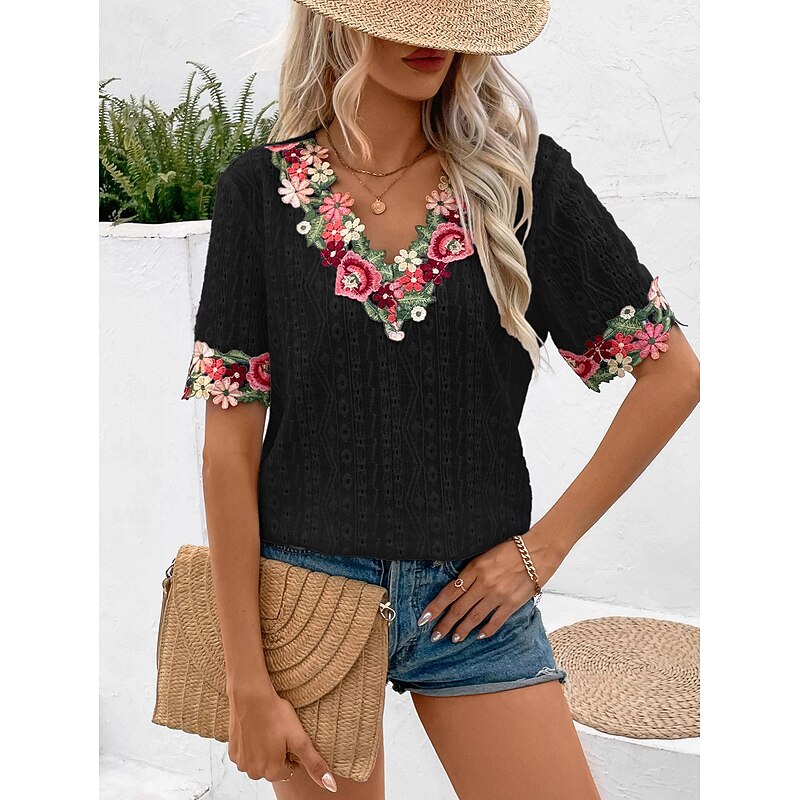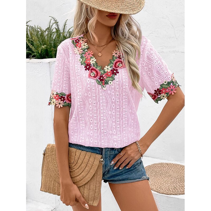 Highlights [Fabric] : Crafted from a lightweight and breathable cotton blend, this women's blouse is perfect for summer weather. The fabric offers a comfortable and breezy feel, suitable for daily wear. [Fit Type] : With a regular fit and micro-elasticity, the blouse allows for ease of movement while maintaining a flattering silhouette. Its short sleeves provide a relaxed and casual style. [Design Highlights] : The blouse is adorned with elegant embroidered eyelet details around the V-neckline and sleeve hems, adding a vibrant yet feminine touch. The intricate embroidery contrasts beautifully with the solid color of the fabric, offering a chic and stylish appearance. [Occasions] : Ideal for daily outings and various casual occasions, this versatile top can be effortlessly styled with jeans or shorts for a laid-back summer look. It's suitable for everything from casual errands to relaxed summer gatherings. [Size Range] : Available in a variety of sizes ranging from S to XL, catering to different body types and ensuring a comfortable and customized fit for women seeking both style and comfort.