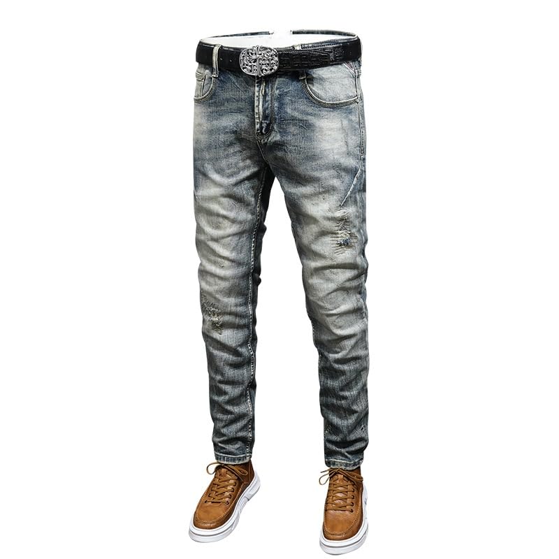 Mens Jeans Retro Light Blue Stretch Slim Fit Printed Ripped Jeans Men Hole Trousers Vintage Casual Pants 6