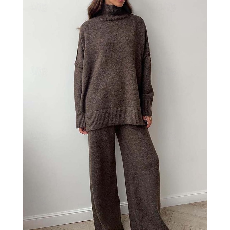 The turtleneck sweater is designed with a classic ribbed knit style and split detailing, adding a modern twist to a timeless silhouette. The set is available in pure, neutral colors like dark gray, coffee, and khaki, making it easy to match with various accessories and footwear.