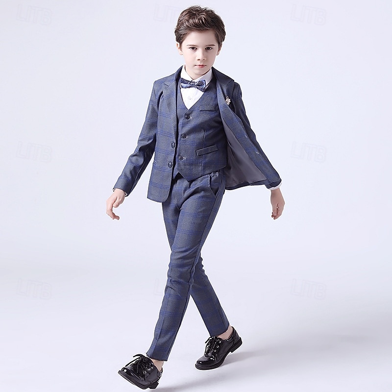 4 Pieces Ring Bearer Suit Boys Kids Suit Formal Suit Blazer & Vest & Pants & Tie Formal Set Formal Party Fashion Cool Plaid Pocket Blue Cotton 5