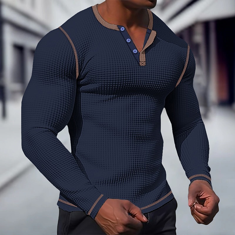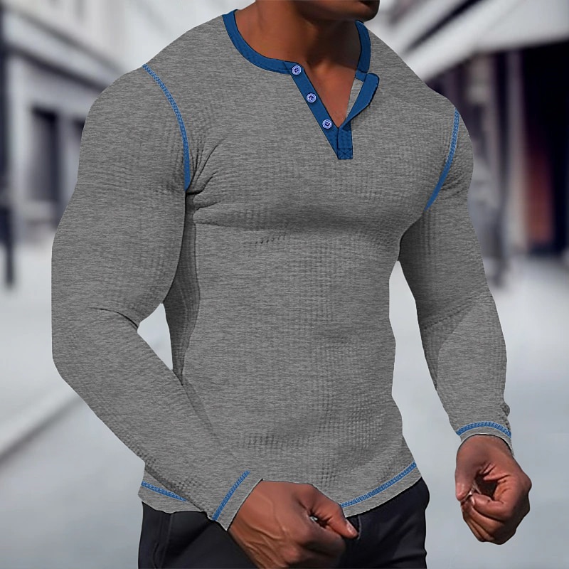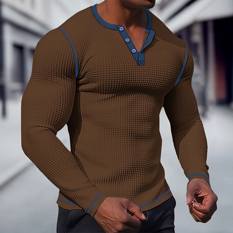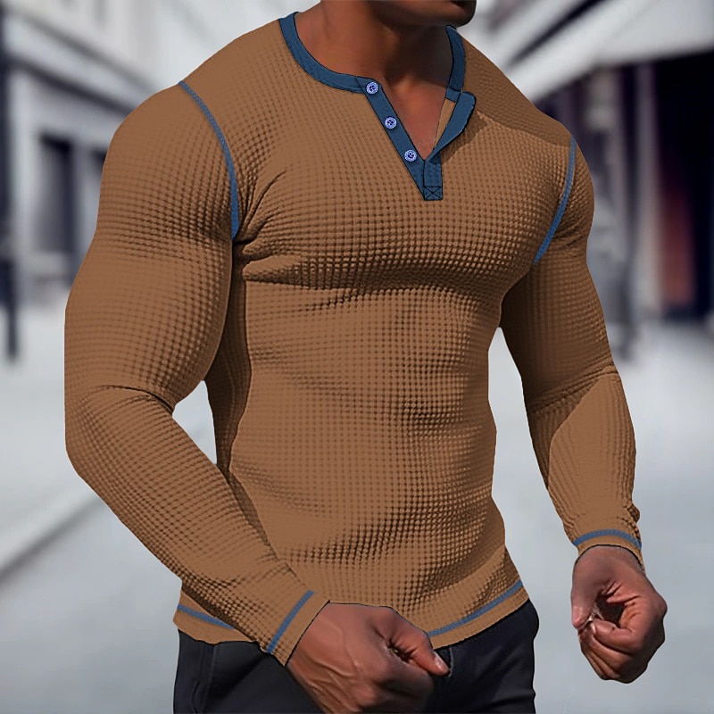 Highlights [Fabric & Fit:] Crafted from a high-quality polyester blend, this men's long-sleeve henley shirt is designed with a micro-elastic material for comfort and flexibility. It offers a slim, athletic fit that enhances the wearer’s physique, making it an ideal choice for anyone looking to combine style with comfort. [Design Features:] The shirt boasts a distinctive waffle-knit texture that adds a layer of visual interest while ensuring breathability. It features a classic henley neckline with a button placket, and stylish contrasting elements such as colored trim around the neck and cuffs. The patchwork design includes eye-catching raglan sleeves, adding a modern edge to this versatile piece. [Occasions:] Perfect for various settings such as street outings, vacations, or casual daily wear. Whether you're heading out for a relaxed day with friends or need something stylish for a semi-casual event, this shirt effortlessly suits a range of occasions with its understated elegance. [Size Range:] Available in a wide array of sizes from S to XXXL, ensuring a comfortable fit for men of different body types. The regular fit accommodates a variety of styles, from laid-back to more polished ensembles. This henley shirt exemplifies the balance between designer fashion and everyday functionality, making it a must-have addition to any wardrobe.