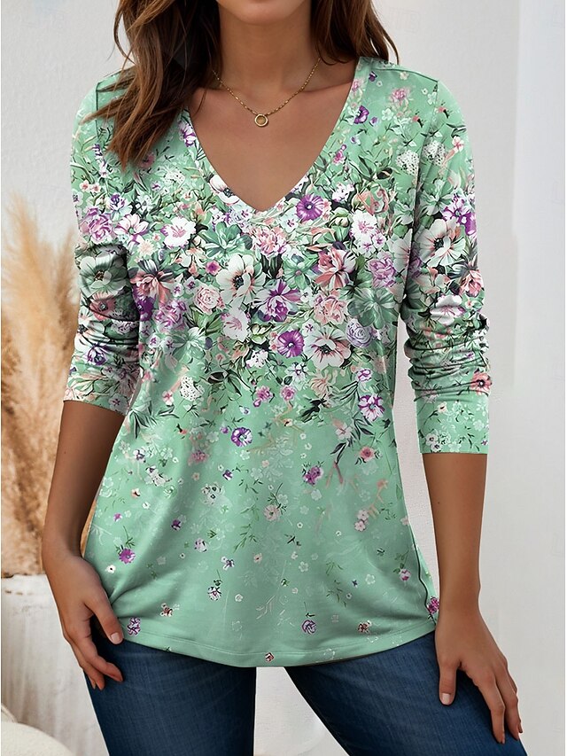 HOT ! Women's T Shirt V Neck Long Sleeve Tunic Floral Graphic Plants Vintage Stylish Classic Regular Tops Daily Print Pink Blue Green Summer Spring Fall