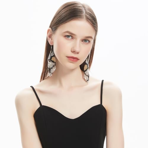 Geometric Beaded Earrings – Long Bohemian Handmade Large Tribal Native Beaded Tassel Drop Earrings for Women, Big Boho Seed Bead Fringe Chandelier Dangle Earrings 7