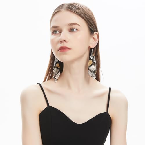 Geometric Beaded Earrings – Long Bohemian Handmade Large Tribal Native Beaded Tassel Drop Earrings for Women, Big Boho Seed Bead Fringe Chandelier Dangle Earrings 5