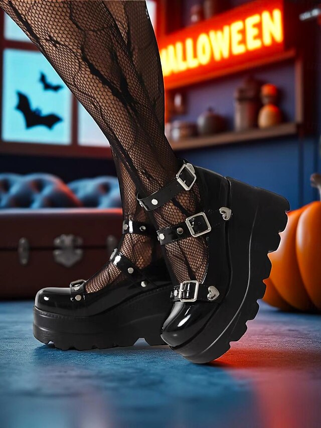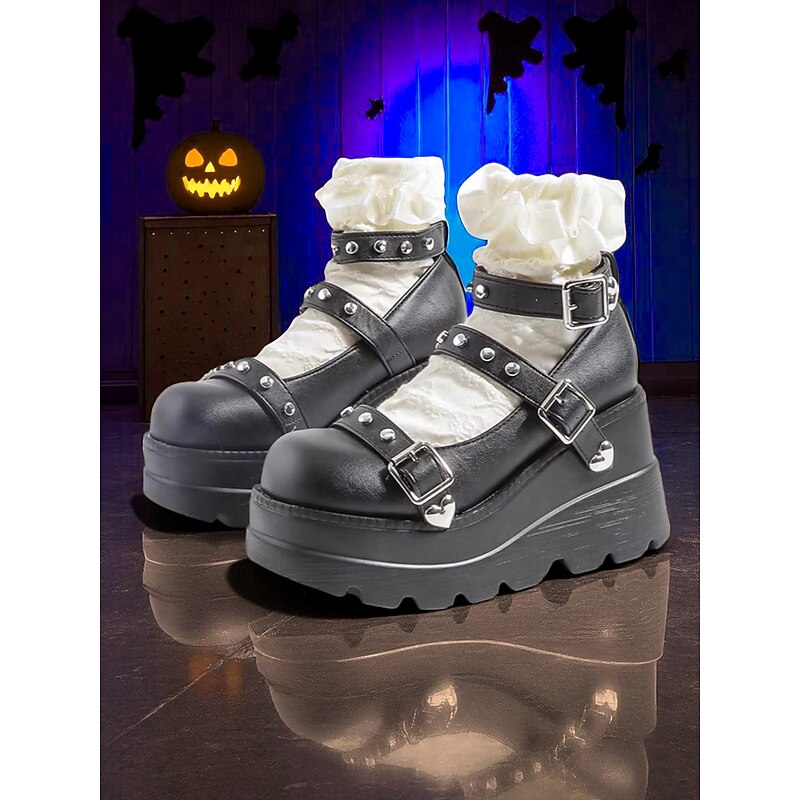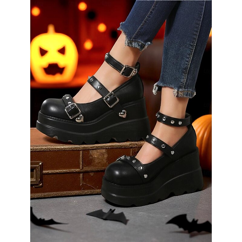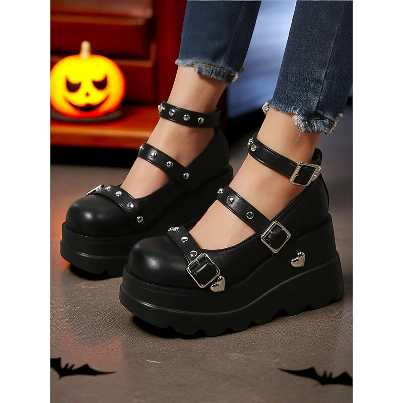 HOT ! Women's 1980s Black Platform Mary Jane Shoes with Buckles and Heart Studs – Gothic Punk Lolita Style for Halloween, Cosplay and Night Out