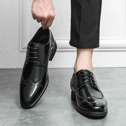 Men's Leather Wing Tips Chunky Low Heel Oxfords Fashion Classic Pointed Toe Lace Up Low Top Dress Shoes Hand Stitched Business Formal Derby Shoes 6