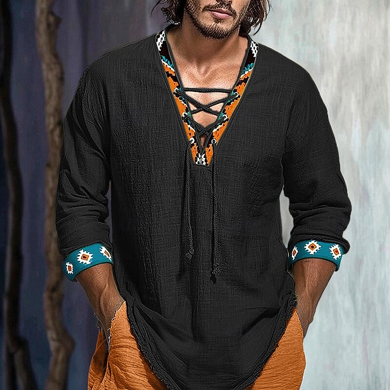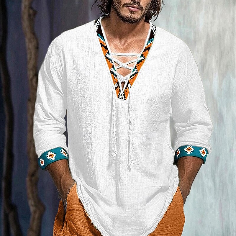 More information about OUKU Men's Shirt Linen Shirt Summer Shirt Beach Shirt Solid Color Vacation Casual Black White Green Long Sleeve V Neck Clothing Apparel Drawstring