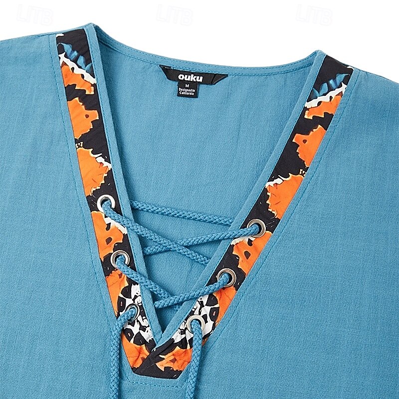 OUKU Men's Shirt Linen Shirt Summer Shirt Beach Shirt Solid Color Vacation Casual Black White Green Long Sleeve V Neck Clothing Apparel Drawstring 12