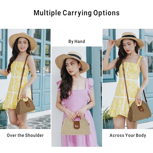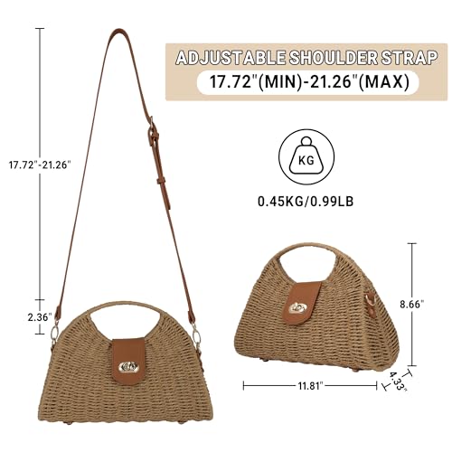 • 【Unique Design】The woven straw handbag features brown faux leather shoulder strap, arc-shaped handle, gold tone hardware and rotating buckle closure, which make this bag look effortlessly stylish