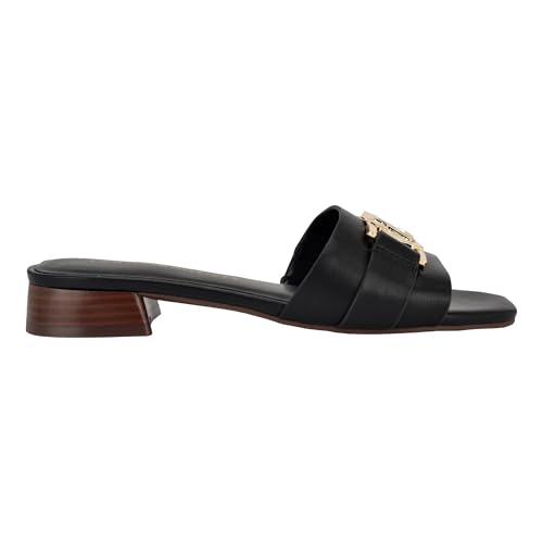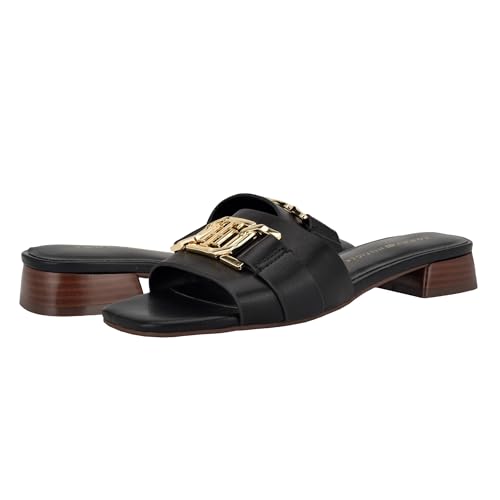• The Tommy Hilfiger Meliei with an iconic metallic logo accent punctuates the bridge of a breezy slide sandal balanced by a square toe and flared block heel. Est. 1985, Tommy Hilfiger is a leading lifestyle brand celebrating the essence of American style.